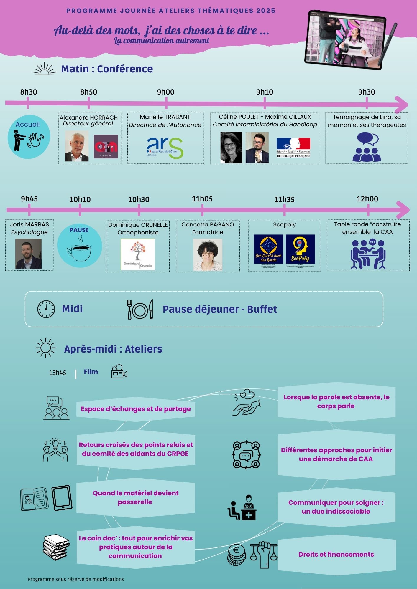 Les ateliers thématiques ont pour but de favoriser la connaissance des services, des outils, des pratiques … adaptés aux personnes en situation de polyhandicap et de permettre aux aidants et aux professionnels de se rencontrer et de partager leurs expériences. La journée se déroulera à :